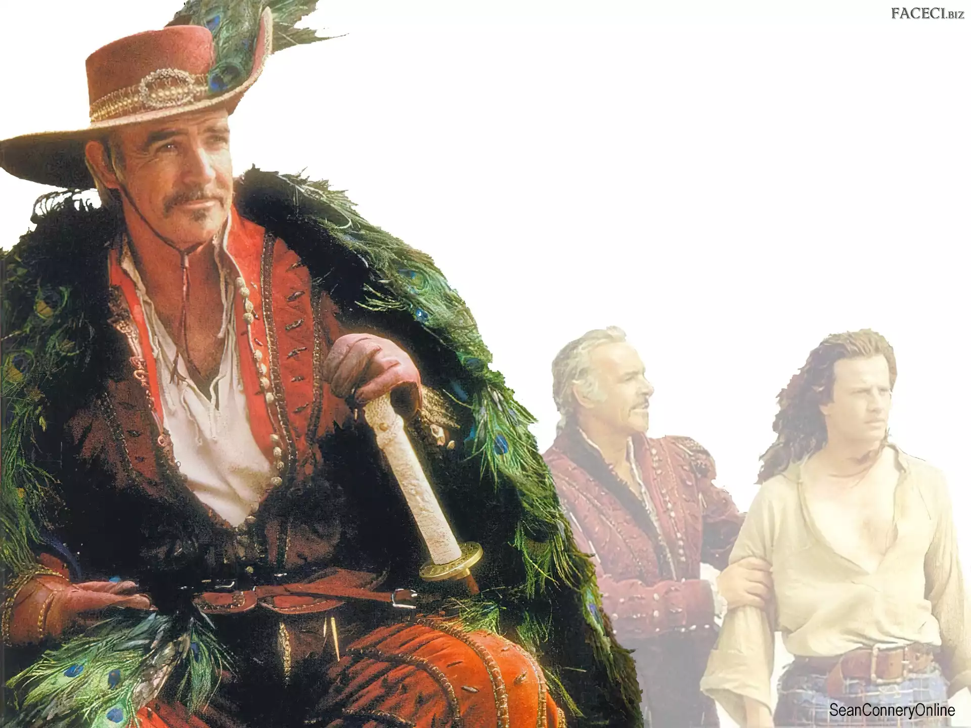 Sean Connery, czarny garnitur ręka, Sean Connery, twarz Sean Connery, płyta Sean Connery, muszka płaszcz, Sean Connery, kapelusz twarze, Sean Connery, miecz Sean Connery, siwa broda Sean Connery, kot Sean Connery, wąsy Sean Connery, Kapelusz Sean Connery, siwe włosy Sean Connery, koszula w paski Sean Connery, pistolet Sean Connery, statuetka